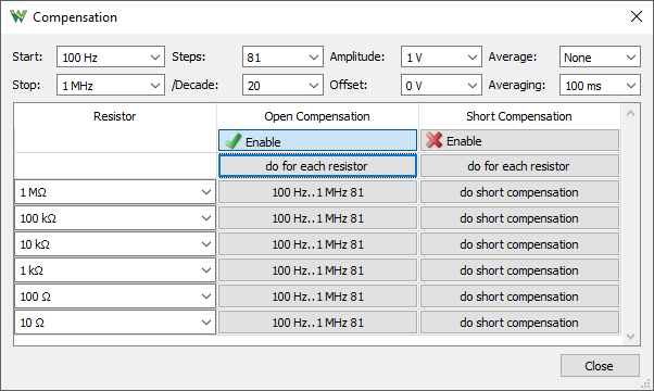 The exact resistor values can be specified in the second column. The open and short compensation can be enabled in the following columns first row and performed with the buttons.
