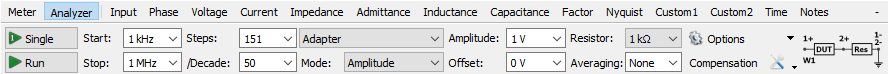 - CV/CC Resistor: lets you specify a DUT voltage/current that will try to reach at each step adjusting the amplitude and also the resistor value. Available with Impedance Analyzer Adapter