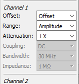 - The further options allow configuration of each oscilloscope channel as follows: Offset, Range, Attenuation, and Coupling.