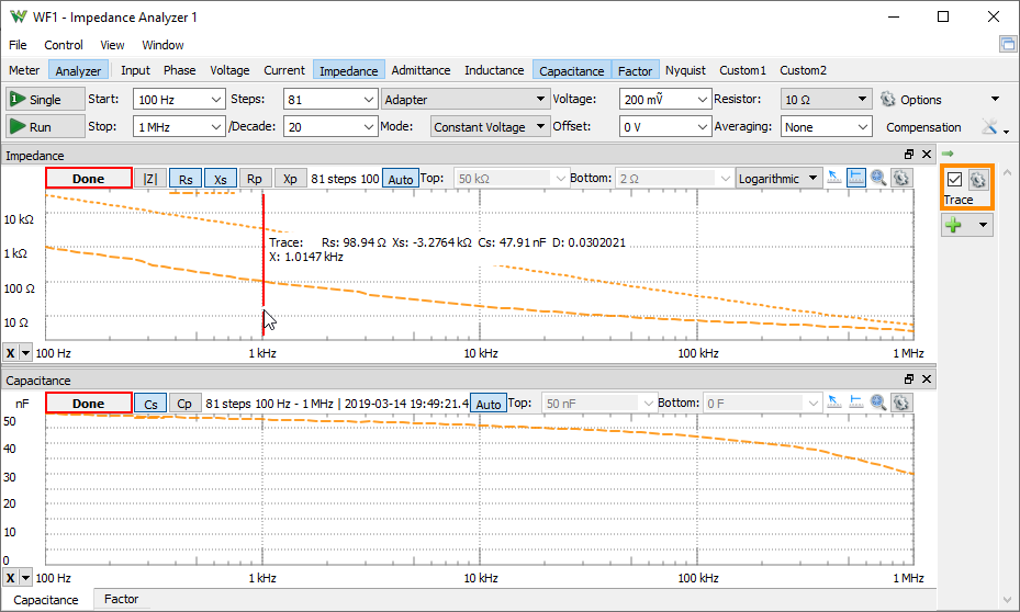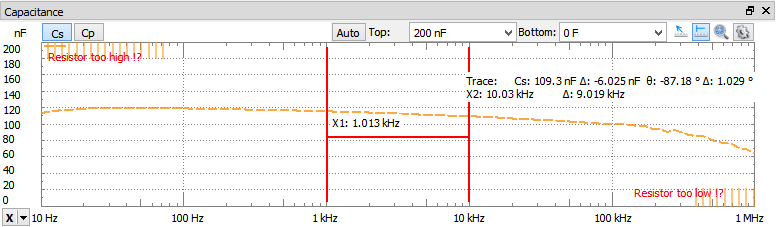 - Capacitance: opens/closes the Capacitance view showing the Series (Cs) and Parallel Capacitance (Cp).