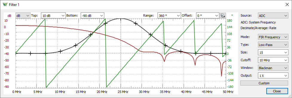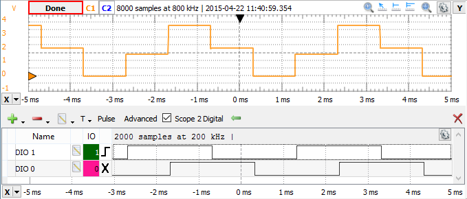 - Record: allows capturing large number of samples at lower rates. In this mode, the samples are streamed through the USB, limiting the rate (depending on the system and other connected devices) at about 1M samples/sec.
