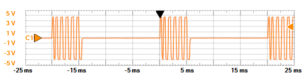 The picture below shows a rising transitions trigger from -3V to +3V configured for time-out at 200 µs.