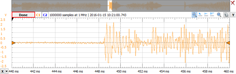- Auto: when the trigger condition does not appear in maximum of 2 seconds and capture time, the acquisition is started automatically. In repeated acquisition mode, when the instrument switches to auto trigger, the next acquisitions are made without waiting again to timeout while a trigger event does not occur and the configuration is not changed. When a new trigger event occurs, or the configuration is changed, the current acquisition will be finished and the next one will wait for the trigger again. It is also the best mode to use if you are looking at many signals and do not want to bother setting the trigger each time.