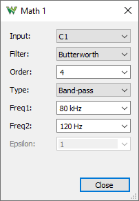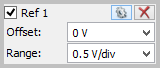 The check-box before the group name enables or disables the respective channel. The drop-down properties button in the top-right corner allows you to configure the channel properties. The math and reference channels also have a close button.