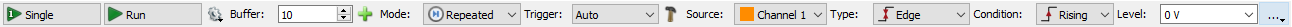 - Run/Stop button: starts a repeated, continuous acquisition, or recording (see Mode). While the acquisition is in progress, the Run button becomes the Stop button.