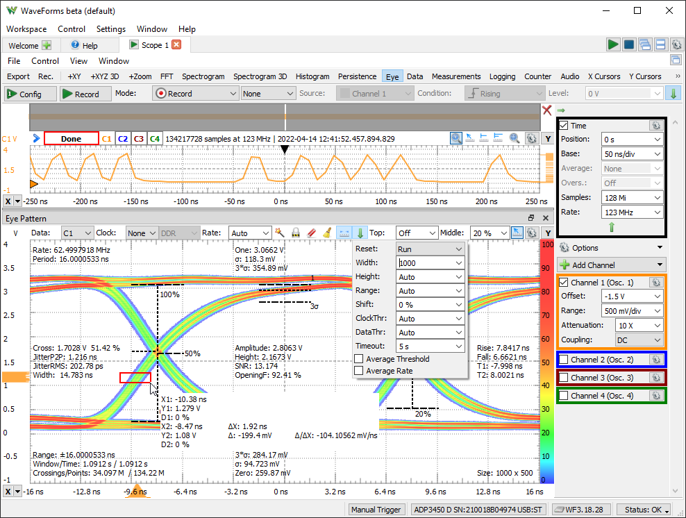 The ADP3450 and ADP3250 can shift the Scope captures at 4 phases, so it can oversample at least by 4 the signals generated by the same device, resulting in a 0.5 GS/s sample rate with 125 MS/s device frequency adjustable under Settings/ Options/ Device.
