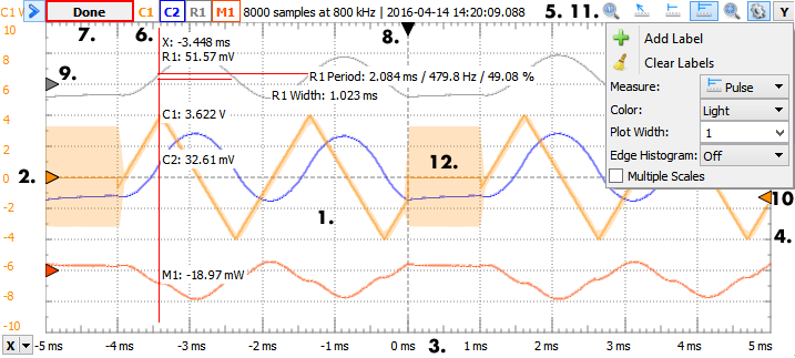 - Base: The time base setting (seconds/division) from the channel configuration toolbar lets you select the rate at which the waveform is drawn across the screen. This setting is a scale factor. For example, if the setting is 1 ms, each horizontal division represents 1 ms and the total screen width represents 10 ms (ten divisions). Changing the sec/div setting allows you to visualize longer or shorter time intervals of the input signal.