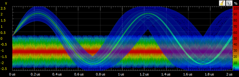Average and Oversampling require repetitive signal and stable trigger with Single or Repeated acquisition. The individual captures are aligned and combined based on peak frequency phase of trigger source channel or Channel 1 when other trigger source is used, or trigger crossing of source channel when no peak or too low frequency is detected. For peak frequency alignment Acquisition # X/X @ MHz is displayed and for trigger crossing alignment Acquisition # X/X.