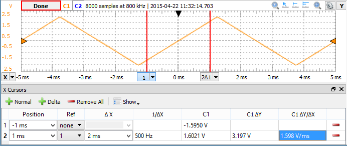 This table shows additional information to cursor tooltips: the 1 / delta x frequency, delta y vertical difference, and delta y / delta x.