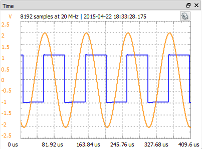 The time plot shows the last oscilloscope acquisition. This view is used to help adjust optimal offset and range for each channel.