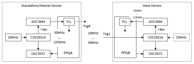 The device can also be used in slave mode with external reference clock of 10-50MHz applied to Trig1, bypassing the FPGA and driving the CDCE6214. The minimum input reference frequency for the CDCE6214 is 10MHz. In this mode we measured less than 4ps jitter on ADC clock relative to the reference clock.