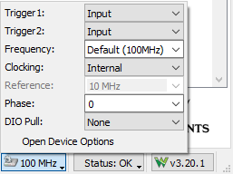 The system clock is adjustable between 50 and 125MHz. This will be the base frequency used for Oscilloscope, Wavegen, Logic Analyzer and Pattern Generator. Each instrument or channel rate will be derived from this frequency.