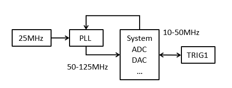 A PLL in the FPGA is used to generate internal clocks, and also a low frequency clock which can be adjusted between 10 and 50MHz, and optionally output on the Trigger IOs.