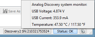 The Analog Discovery 2's system monitor displays the voltage, current, and temperature. In the main window, click the button in the status bar to show this information.