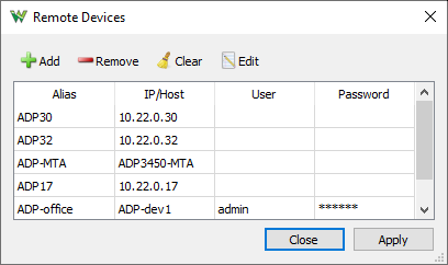 The Remote Devices is intended to manage devices that are not discoverable like on a remote VPN. These entries are stored in current users folder unecrypted. For security concern the user name and password can be left empty and these will be asked when connecting to the device.