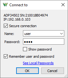 When connecting to a network device with enabled authentication the entered user and password can be remembered locally.