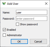 The Device Users lets you manage the accounts on a device. Up to 20 users can be added for a device. When the authentication is enabled connection to the device over network is only allowed with stored account. Login with Admin users can manage the users list. Without Admin right the user is only allowed to use the device and change its password.
