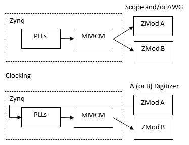 There are 4 configurations (FPGA/PL images) provided to support one Zmod, two identical ones or combinations of Zmod Scope/Digitizer/SDR (ADC) and AWG (DAC) loaded in ZMOD A and B. The suitable configuration is automatically selected based on the loaded Zmods.
