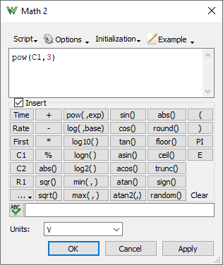 The Add/Custom Channel measurement opens a script editor with an average calculation example script. A custom measurement involving one Channel's data can be created here. This will be added to the Defined Measurement Custom category list to be used for other channels.