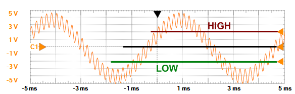 - Window: It triggers on entering or exiting the low or high levels specified by the level and plus-minus the hysteresis. The Length option can be used for glitch filtering.