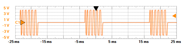 Pulse: If the trigger type is set to Pulse, then the oscilloscope will trigger if a positive/negative pulse has a larger/smaller length than the one already set by the user. For example, if the pulse is smaller than the length set, and the triggering condition is set to more, the oscilloscope will not trigger.