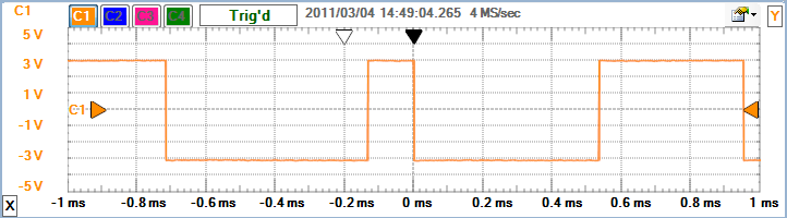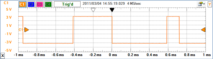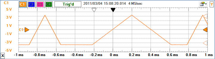 The picture below shows a rising transitions trigger from -3V to +3V configured for time-out at 200 µs.