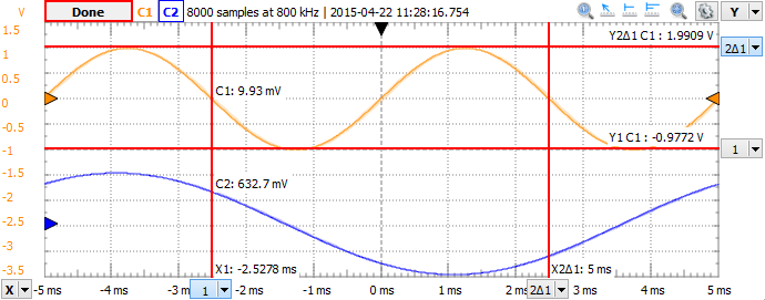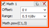 - Auto Set button: performs automatic adjustment of the enabled real and math channels, and trigger configuration according to the input signals. The offset and range of the real channels is determined by the minimum and maximum input levels of one second time span. The trigger is set to rising edge of the channel with the lowest frequency and higher amplitude input signal.
