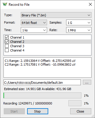 The Record to File can be opened under Control menu or Rec. toolbar button. This lets you capture samples directly to file in Binary, NI TDMS, WAV or text file.