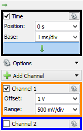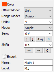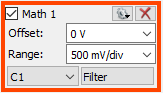 The check-box before the group name enables or disables the respective channel. The drop-down properties button in the top-right corner allows you to configure the channel properties. The math and reference channels also have a close button.