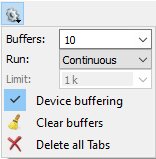 - Buffer: The performed acquisitions are stored in the PC buffer in time order. This makes it easy to review a series of repeated acquisitions. The new acquisitions are stored after the currently selected buffer position. If you change the position in the buffer and start a new acquisition, the positions after the selected one will be lost.