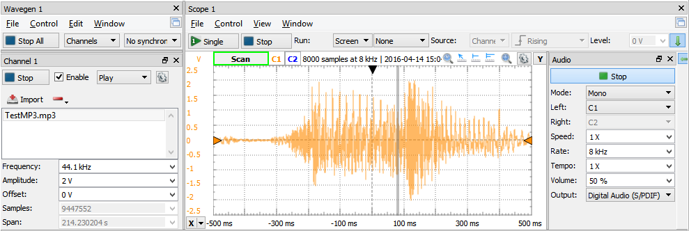 - Tempo: lets you skip capture samples. This is useful in case you capture (record) at high frequency, since the computer audio usually tops at 192kHz. For instance, if you capture at 1MHz with Tempo 10x will playback only every 10th samples, so with 100kHz you can play back at normal (1X) Speed.