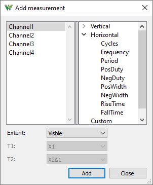T1 and T2 are time positions relative to T0. The value of these: for Capture extent represent the first and last sample of the capture, for Visible the currently visible time span, and for Cursor the selected X cursors positions. The Channel.getData(T1,T2) returns the samples for the time span, Channel.measure("name", T1, T2) the measurement performed between T1 and T2.