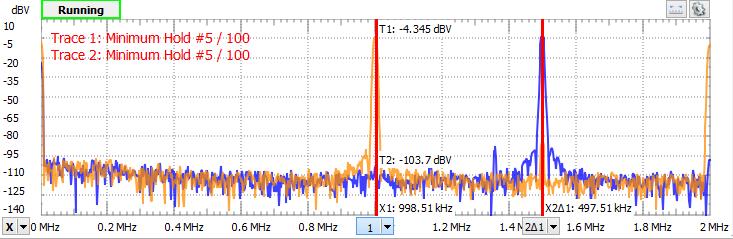 - WoSpur: Worst spur level may or may not be a harmonic of the original signal; DC and bins on the descending slope are excluded.