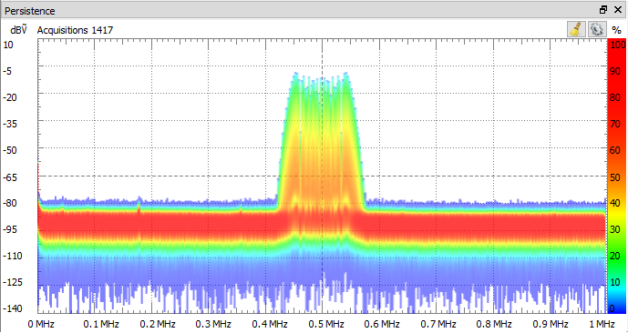 Persistence view superimposes multiple waveform acquisitions on the same view. The more frequent waveforms are drawn with hotter colors than rare ones. The view is cleared by the clear button, after making any configuration change, or restarting repeated acquisition.