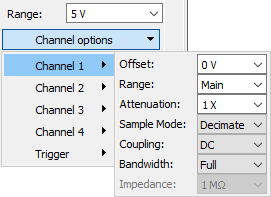 The options in the drop-down menu allow configuration of each oscilloscope channel as follows: Offset, Range, Attenuation, Sample Mode, Coupling, Bandwidth, and Impedance; and to configure trigger. Having the Main option for Range, the range will be the Range value set above the Channel options.