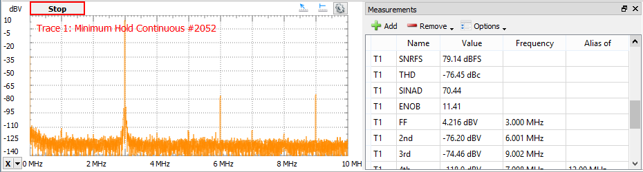 - WoSpur: Worst spur level may or may not be a harmonic of the original signal; DC and bins on the descending slope are excluded.