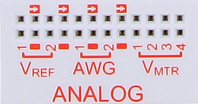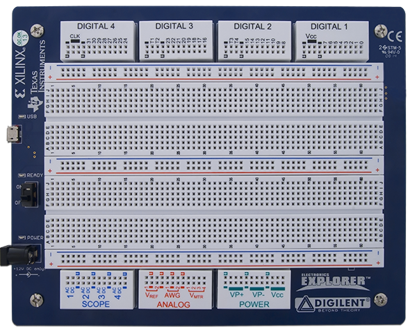- The Ready LED will light when the Output Enable switch is ON and the WaveForms application is connected to the board.