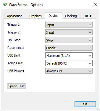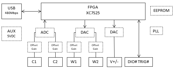 - The Wavegen channel outputs can be captured using in-device digital loopback or analog readback (of 8ms resolution) for the power supply channels.