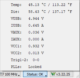 The Analog Discovery 3's system monitor displays the voltage, current, and temperature. In the main window, click the button in the status bar to show this information.