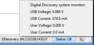 The Digital Discovery's system monitor displays the voltage, current, and temperature. In the main window, click the button in the status bar to show this information.