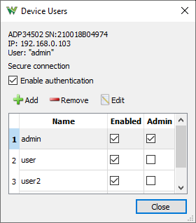 The Device Users lets you manage the accounts on a device. Up to 20 users can be added for a device. When the authentication is enabled connection to the device over network is only allowed with stored account. Login with Admin users can manage the users list. Without Admin right the user is only allowed to use the device and change its password.