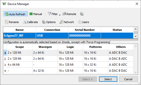 In order to use the Eclypse Z7 and Zmods with WaveForms the following firmware needs to be booted from the SD card or QSPI flash. These are deployed by the WaveForms installer and can be found in the following paths:
