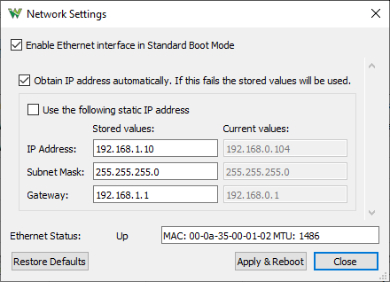 The Network Settings lets you configure the Ethernet port. By default the Ethernet is disabled but it can be enabled with USB connection.