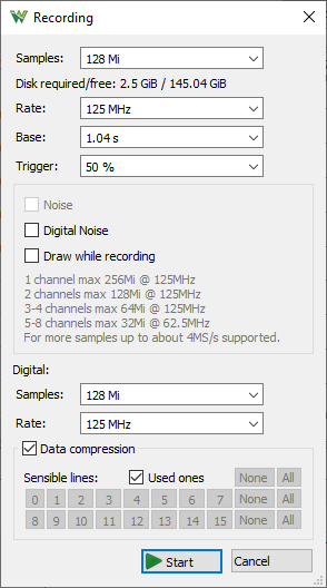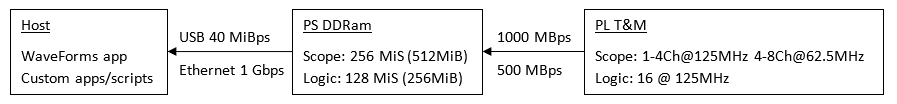 Most of the device embedded DDR RAM is used as Scope and Logic Analyzer buffer. It can capture up to 4 oscilloscope channels at up to 125 MHz or up to 8 channels up to 62.5 MHz. It supports device buffering (memory segmentation) for up to 32768 captures with < 1 us latency.