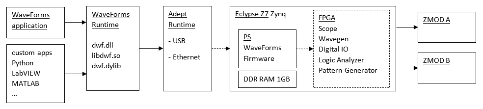 The WaveForms support for Eclypse Z7 and Zmods is closed source, including the application, API library, firmware and FPGA configurations. It can be used with WaveForms application and SDK/API from a computer.