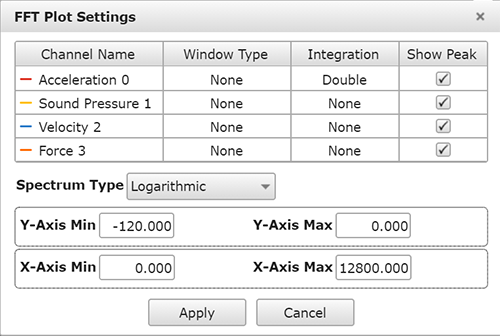 - Logarithmic: Measures the spectrum and plots the data as dB relative to full-scale.